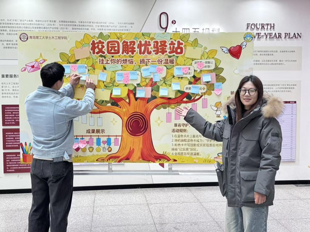 本次“校园解忧驿站”活动以温情化、轻量化的形式,搭建了学生之间情感支持与精神互助的平台,为构建和谐人文校园增添了积极动力。下一步,土木工程学院秉承“温暖融入日常、互助随处可见”的理念,把学生的“小心事”记在心里、“小烦恼”放在心上,精准聚焦学业压力、生活困惑、情绪调节等方面的身心需求,推出更多接地气、有温度的微活动,让友爱互助的氛围浸润校园每个角落,实现时时有暖意、处处见真情、人人享关怀。(撰稿:杜诗琳;审核:王鹏飞)