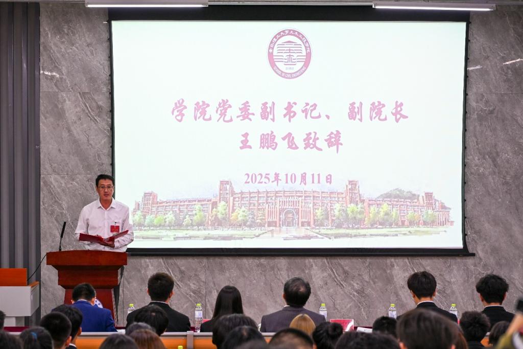 王鹏飞代表学院党委讲话,他对过去一年学生会、研究生会的工作表现给予了充分肯定。他表示,新一届学生会、研究生会要以习近平总书记关于青年工作的重要论述为指引,筑牢思想根基,强化服务意识,在推进学院高峰学科建设、助力学校高质量发展中展现土木青年的担当,并希望全体同学将个人理想融入国家发展伟业,坚定理想信念,为中国式现代化建设贡献青春力量。