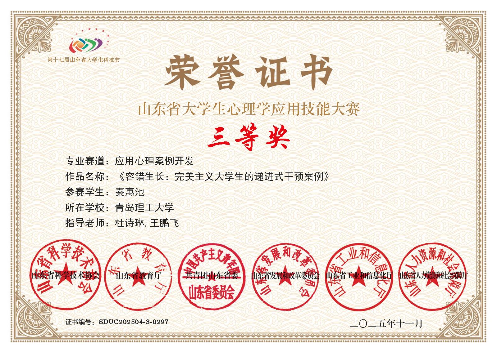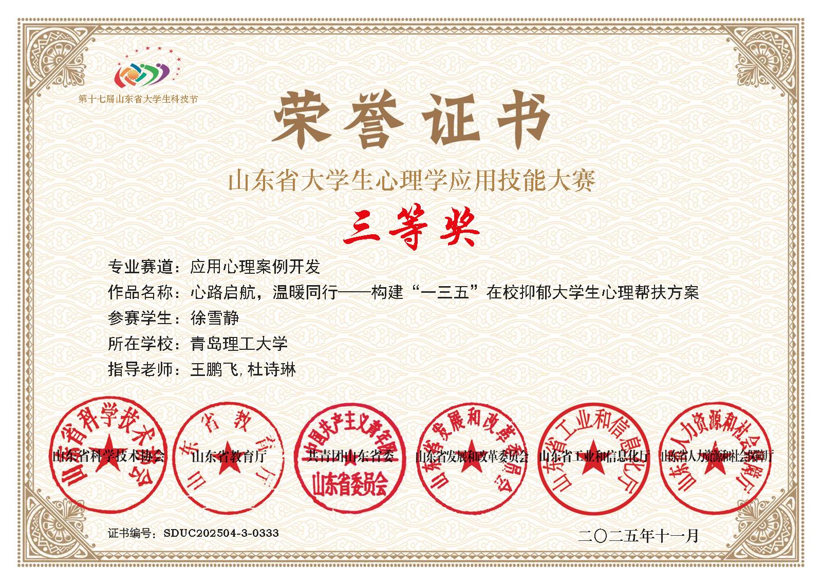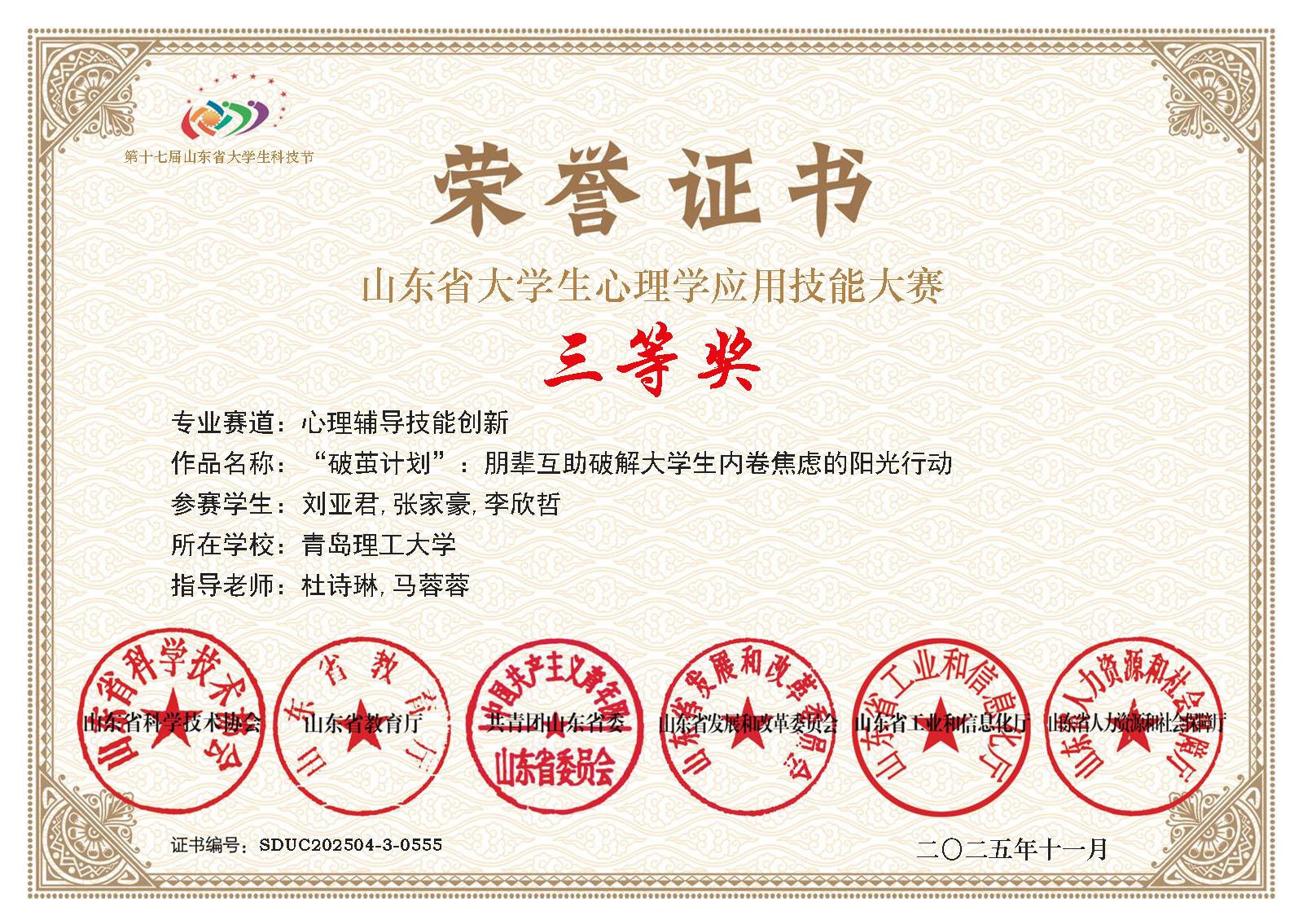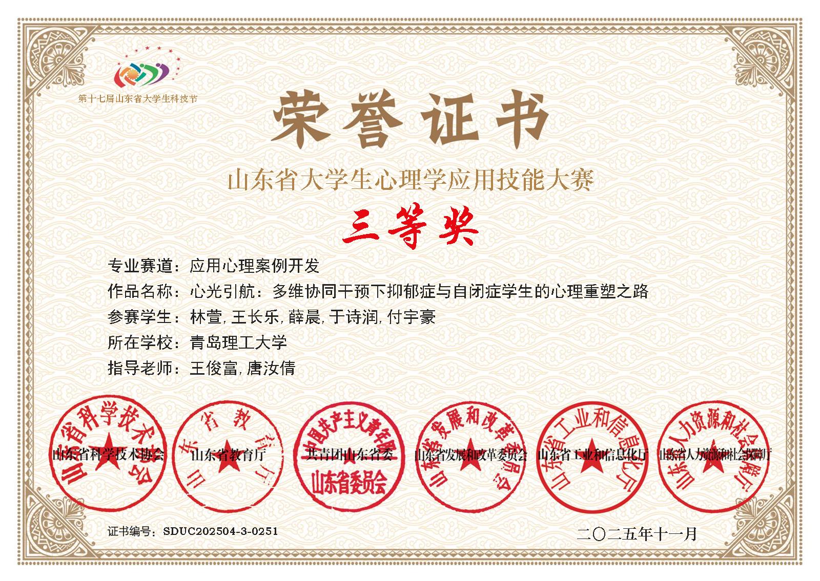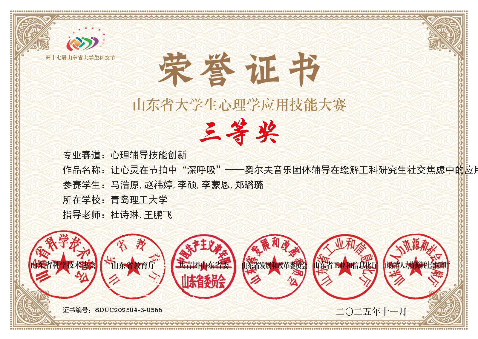 近日,由山东省科学技术协会、山东省教育厅、共青团山东省委等六部门联合主办的第十七届山东省大学生科技节大学生心理学应用技能大赛决赛圆满落幕。青岛理工大学土木工程学院学子凭借扎实的专业素养、创新的实践能力和出色的临场表现,在全省近140所高校、13000余名参赛选手的激烈角逐中脱颖而出,一举斩获9项省级荣誉,包含二等奖2项,三等奖7项,充分展现了学院在心理健康教育实践中的显著成效。