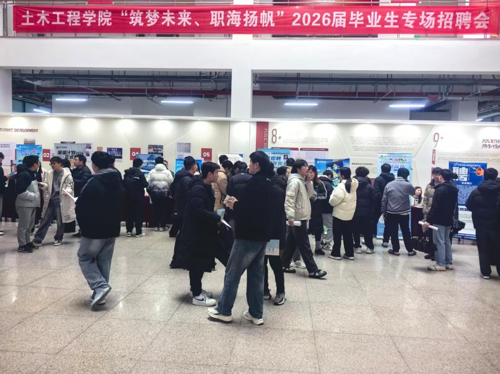 为推进毕业生高质量充分就业,12月23日上午,土木工程学院“筑梦未来,职海扬帆”2026届毕业生专场招聘会在土木楼一楼大厅成功举办。