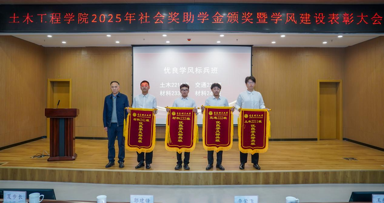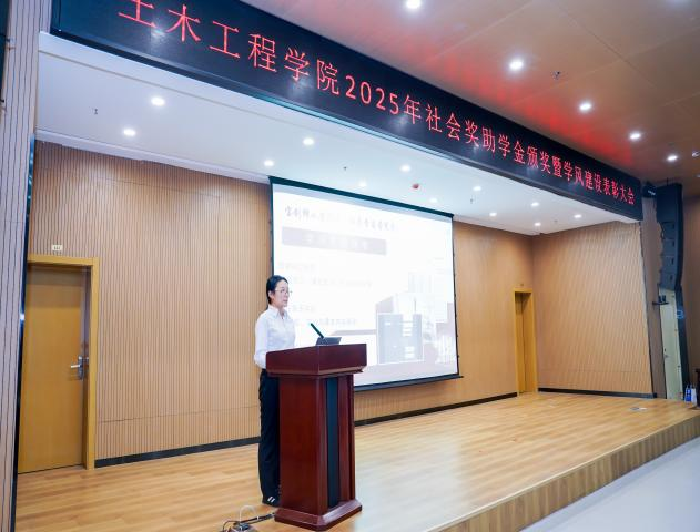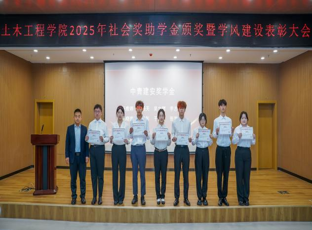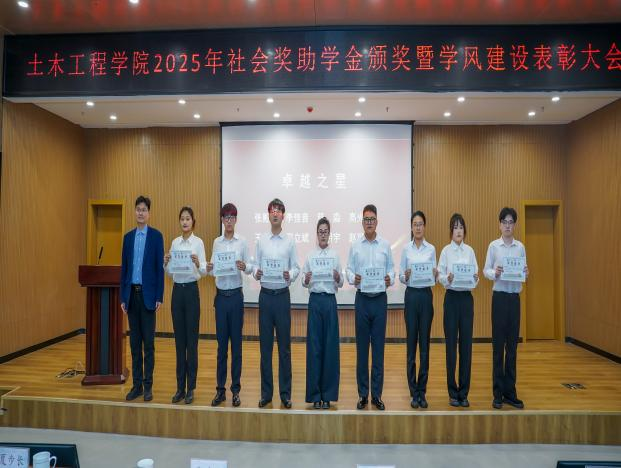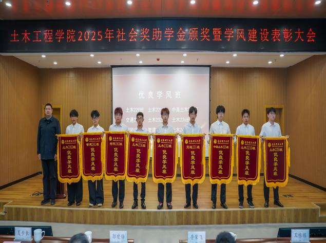 土木工程学院副院长孙林娜宣读《土木工程学院关于表彰2025年学风建设先进集体、先进个人的决定》。郭建锋和企业代表、学生处领导、学院领导分别为先进集体和优秀个人颁发锦旗和荣誉证书。