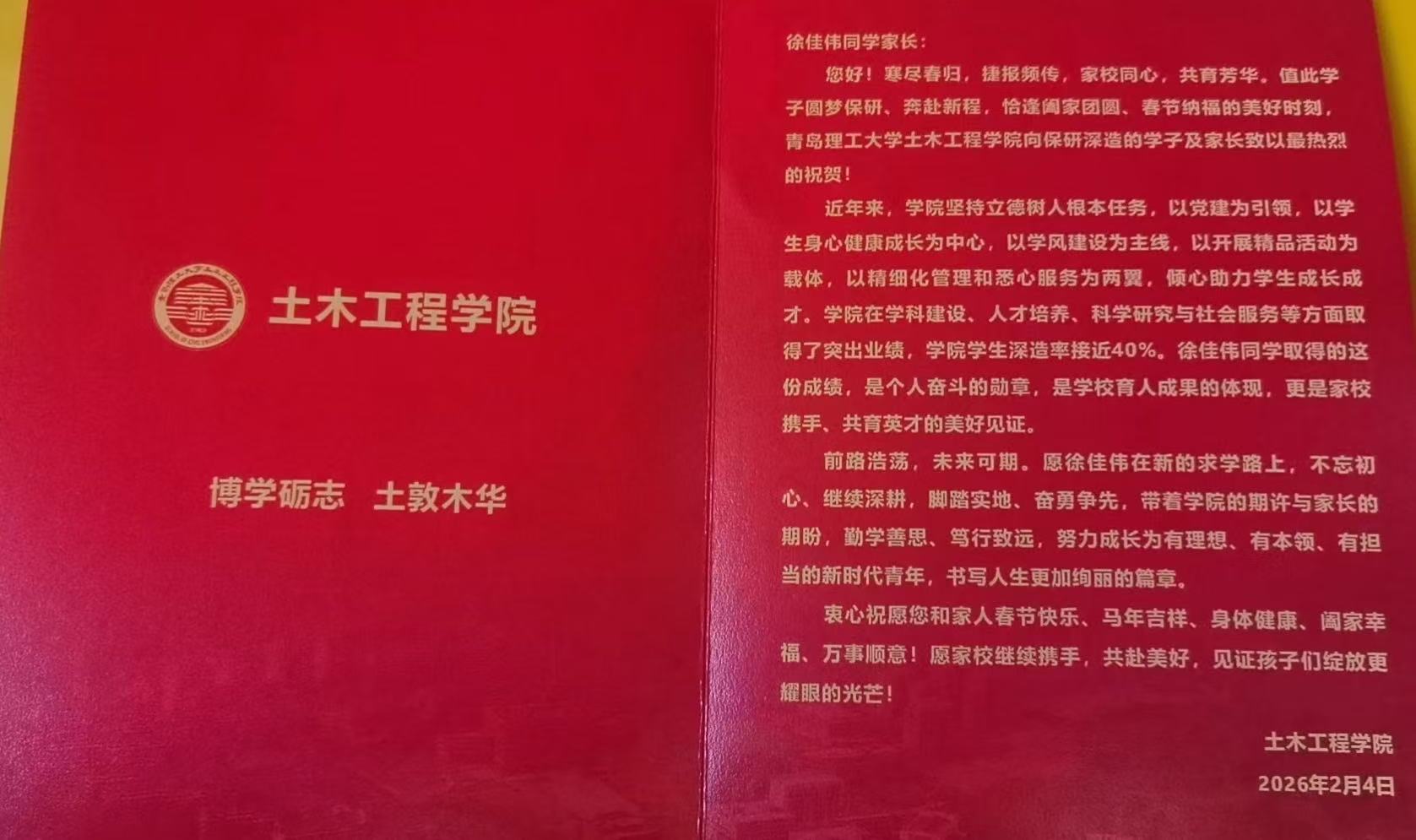 近日,土木工程学院40名保研学子及家长,陆续收到了学院精心寄送的新春贺信。信封载情,笔墨传意,这封饱含关怀与期许的信件,在马年春节来临之际,将学院的祝贺与祝福送到保研学子家中,搭建起家校共育的连心桥,也让这份保研荣光成为冬日里最动人的温暖。