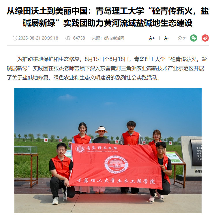 中华网:从绿田沃土到美丽中国:青岛理工大学“砼青传薪火,盐碱展新绿”实践团助力黄河流域盐碱地生态建设