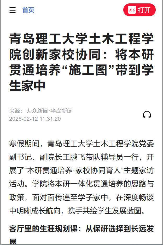 大众新闻/半岛新闻:青岛理工大学土木工程学院创新家校协同:将本研贯通培养“施工图”带到学生家中